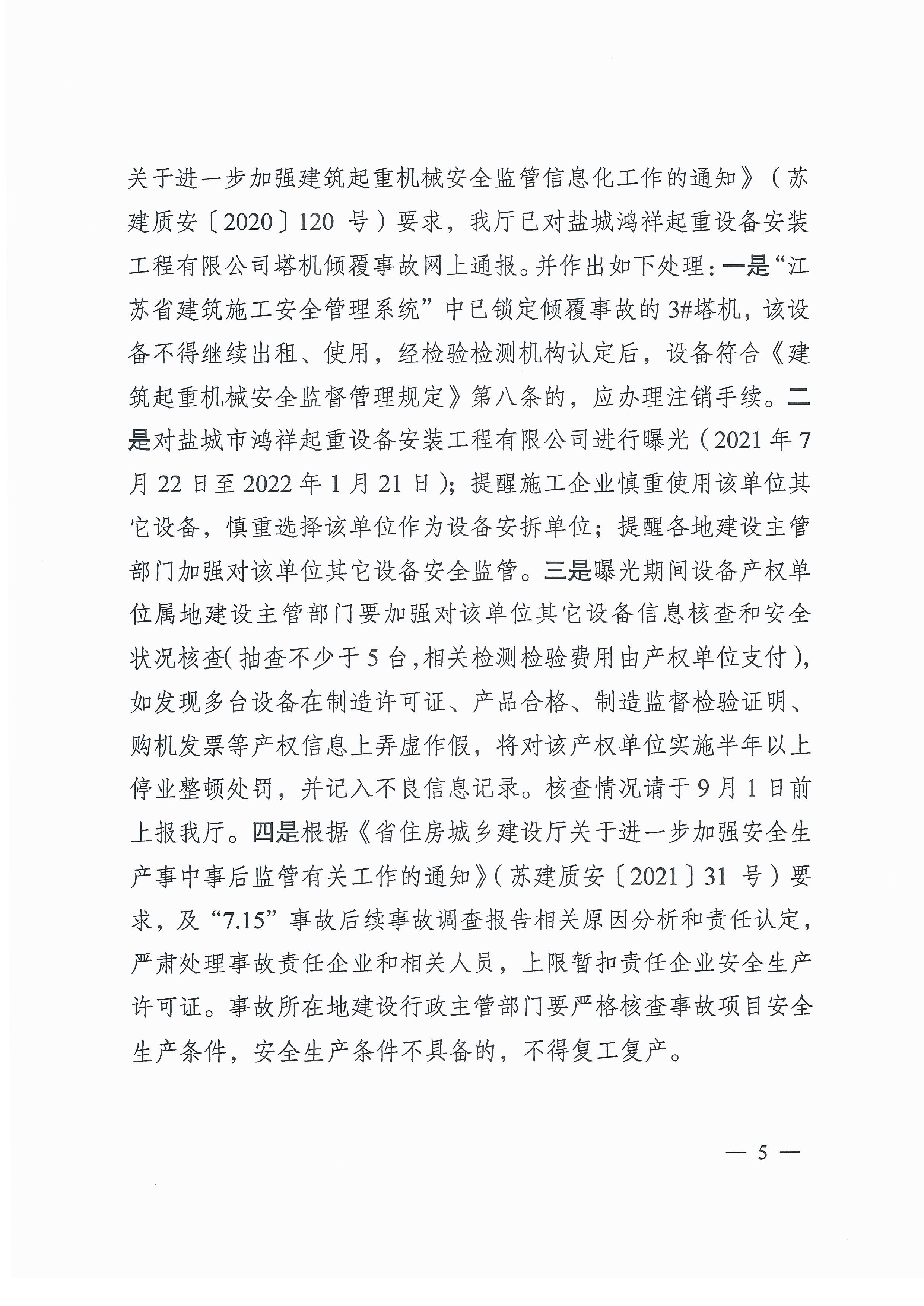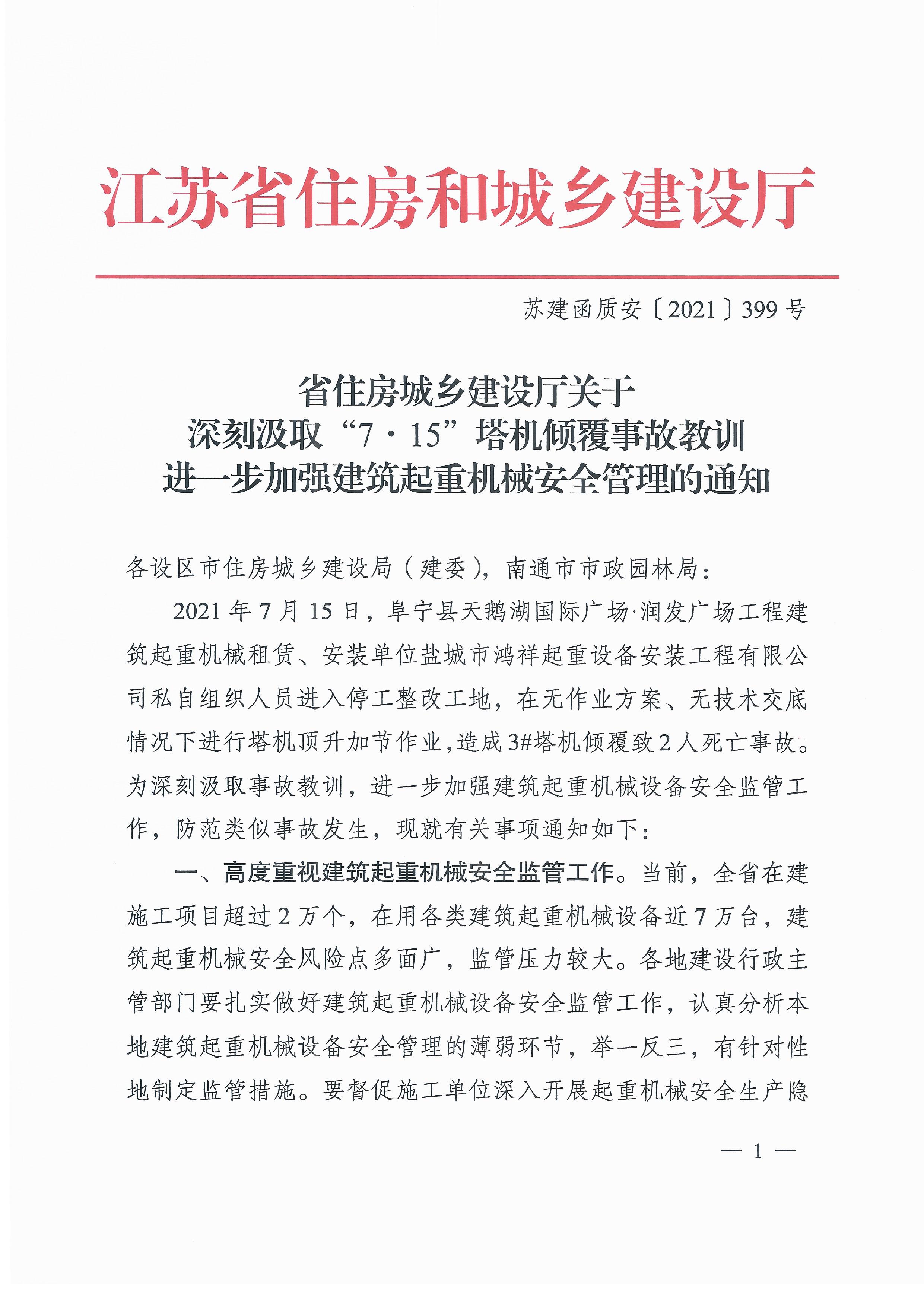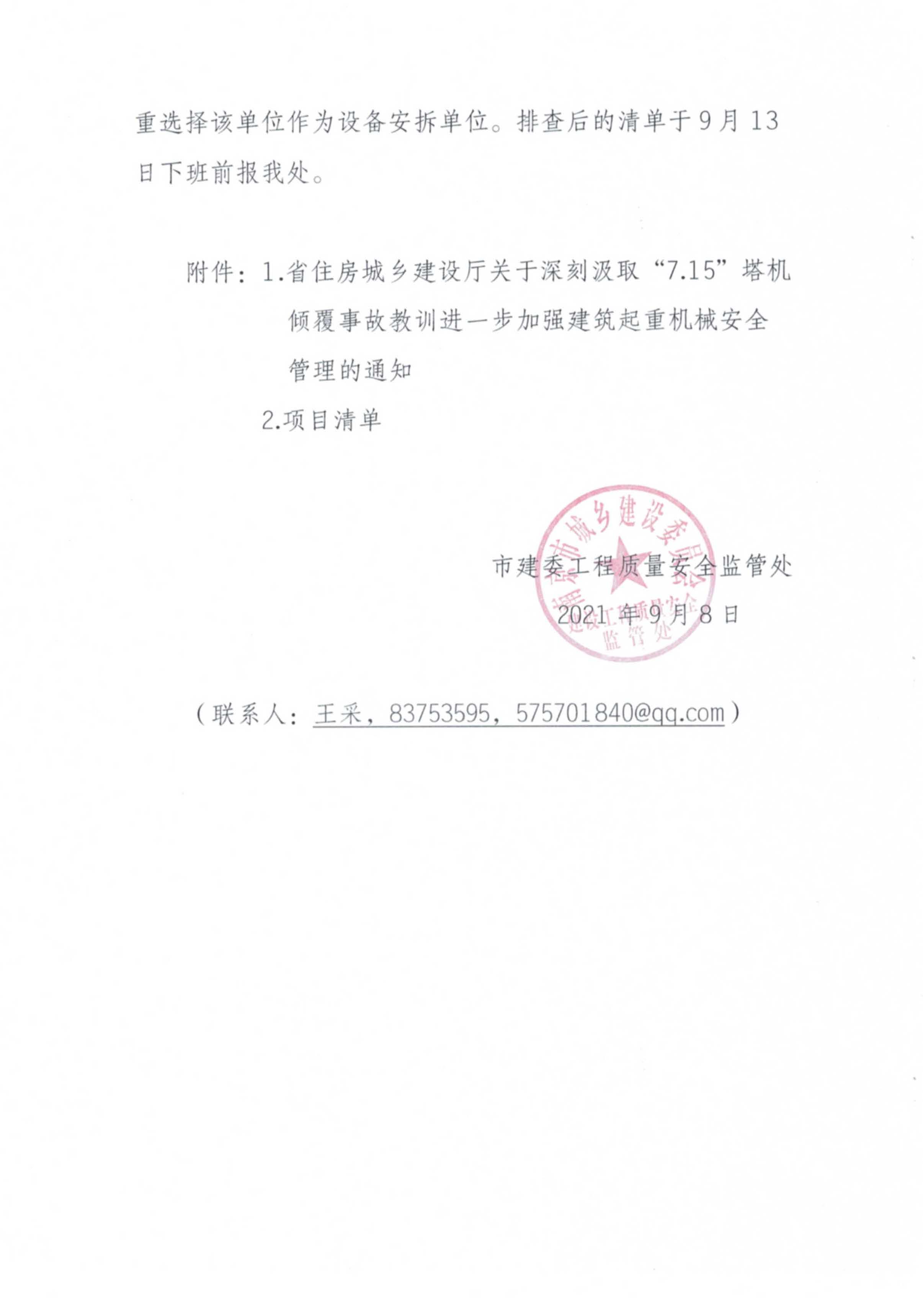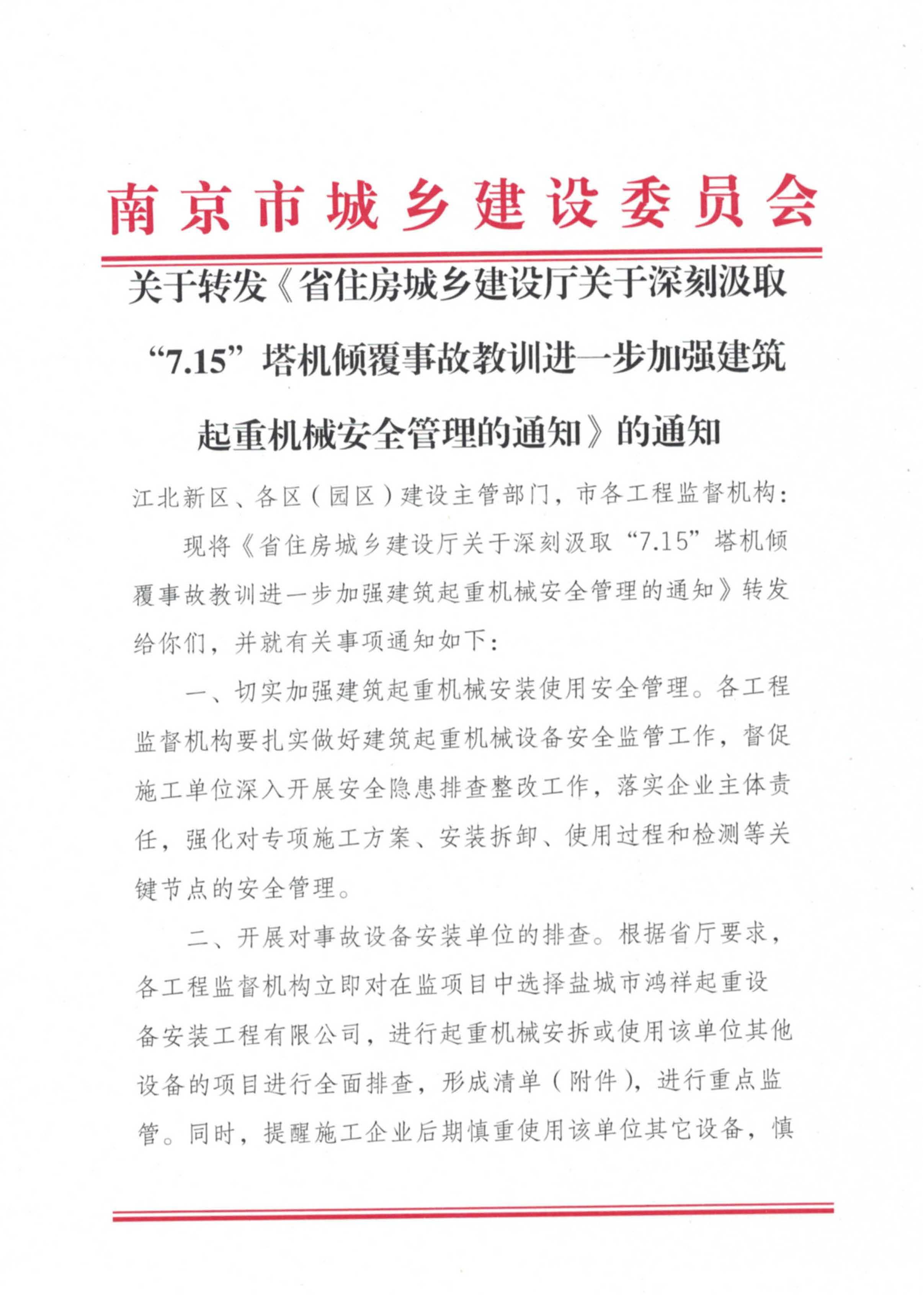 关于转发《省住房城乡建设厅关于深刻汲取7.15塔机倾覆事故教训进一步加强建筑起重机械安全管理的通知》