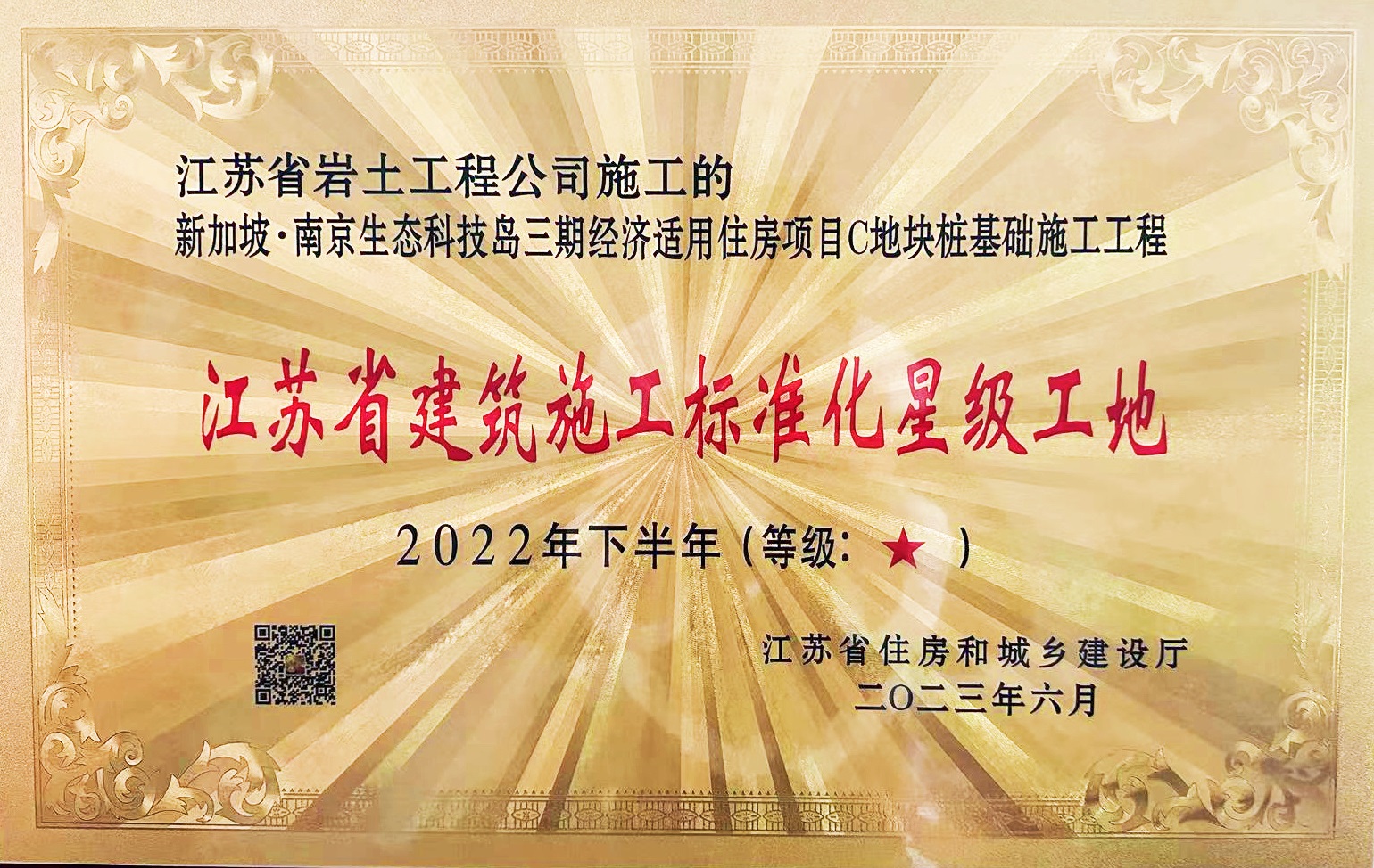 新加坡·南京生态科技岛三期经济适用住房项目C地块桩基础施工工程获2022年下半年江苏省建筑施工标准化星级工地