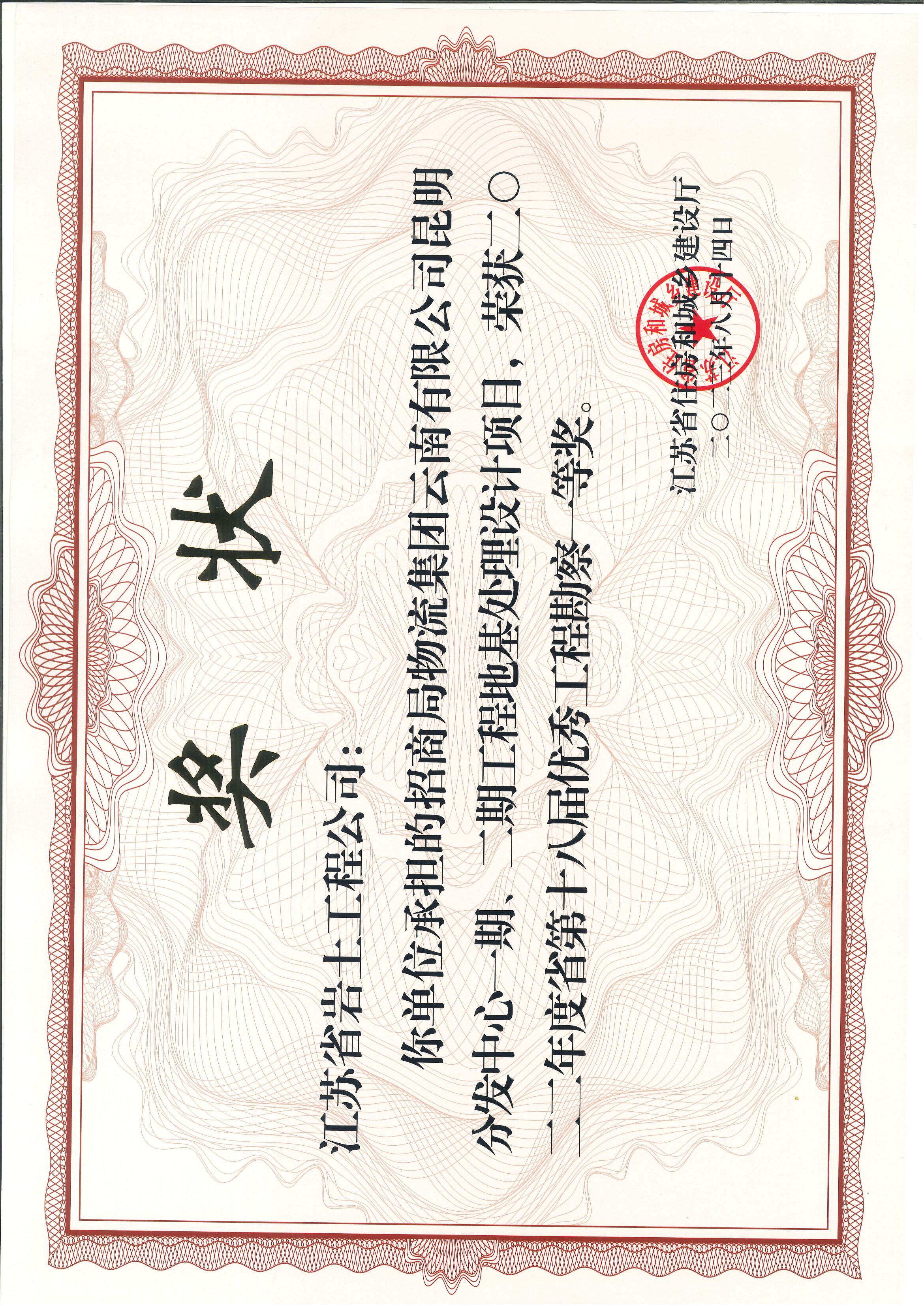 招商局物流集团云南有限公司昆明分发中心一期、二期工程地基处理设计项目获得2022年度省第十八届优秀工程勘察一等奖