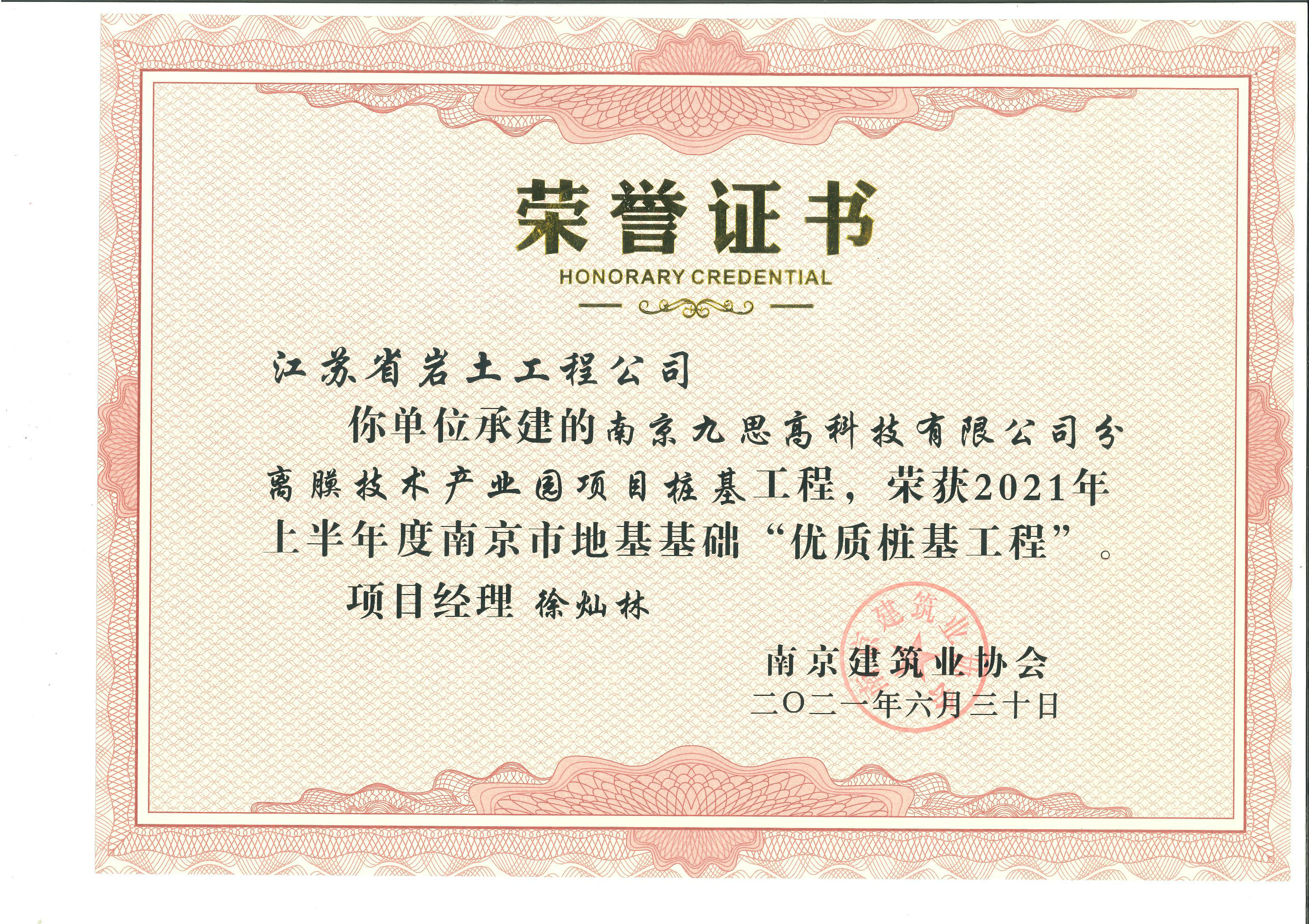 南京九思高科技有限公司分离技术产业园项目桩基工程获2021年上半年度南京市地基基础“优质桩基工程”