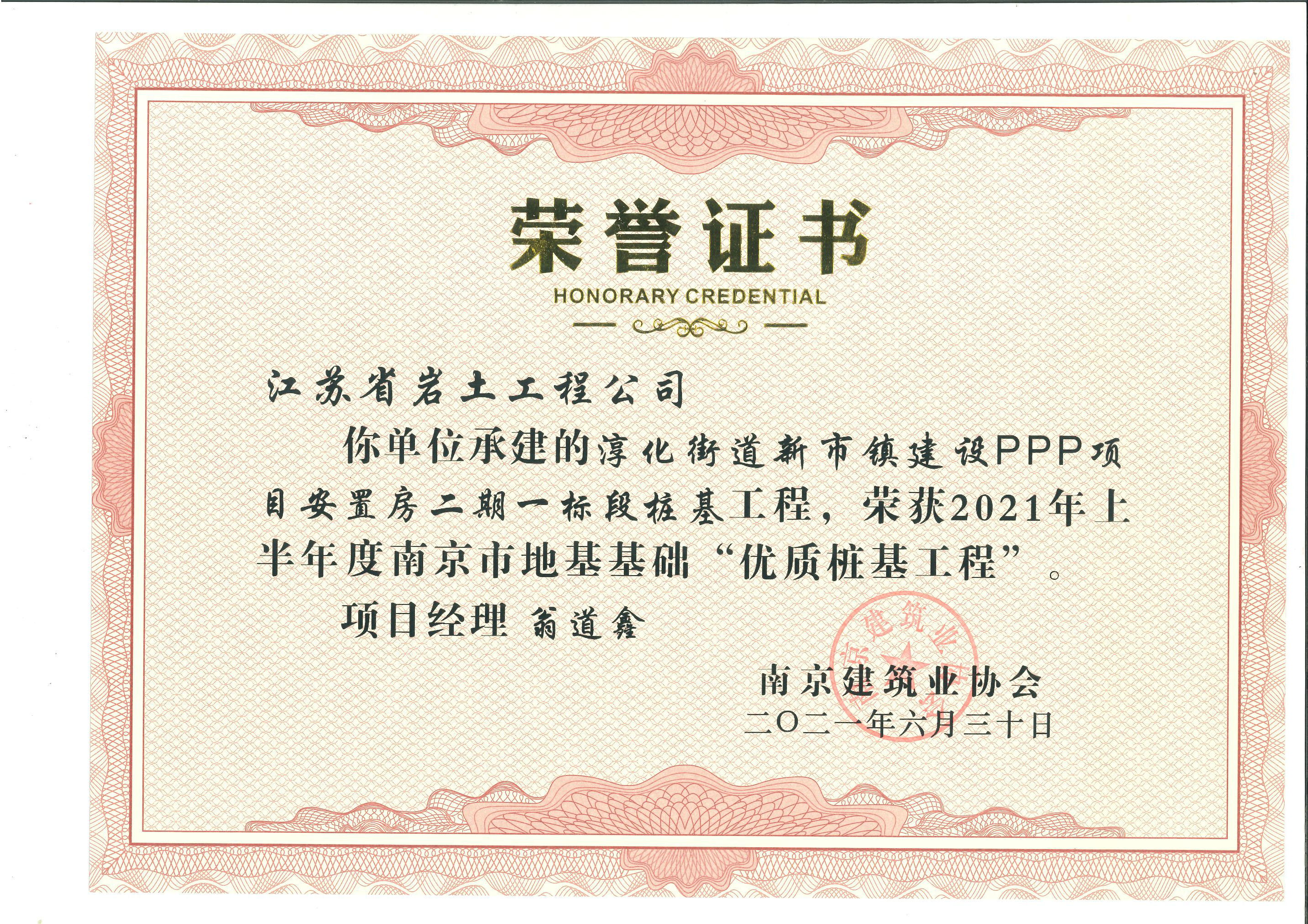 淳化街道新市镇建设PPP项目安置房二期一标段桩基工程获2021年上半年度南京市地基基础“优质桩基工程”