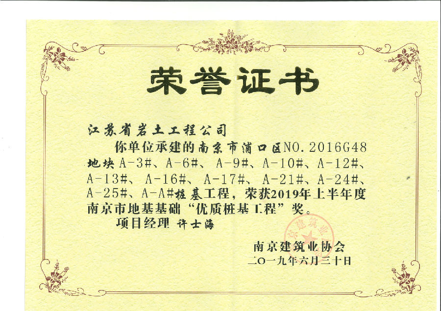 南京市浦口区N0.2016G48地块桩基工程获2019年上半年度南京市地基基础“优质桩基工程”奖