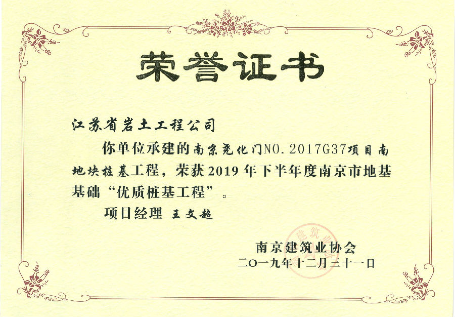 南京尧化门N0.2017G37项目南地块桩基工程获2019年下半年度南京市地基基础“优质桩基工程”