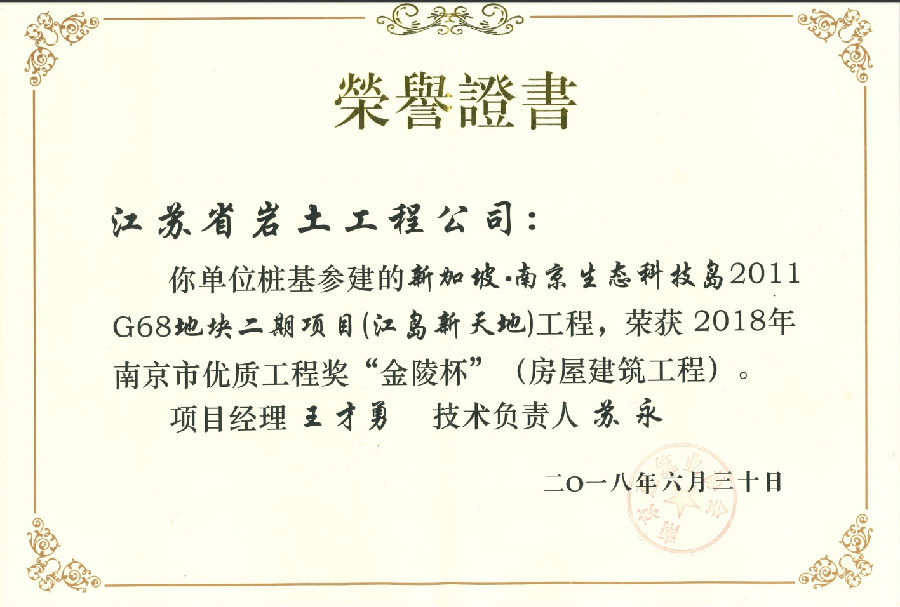 新加坡南京生态科技岛2011G68地块二期项目(江岛新天地)获2018年南京市优质工程奖“金陵杯”