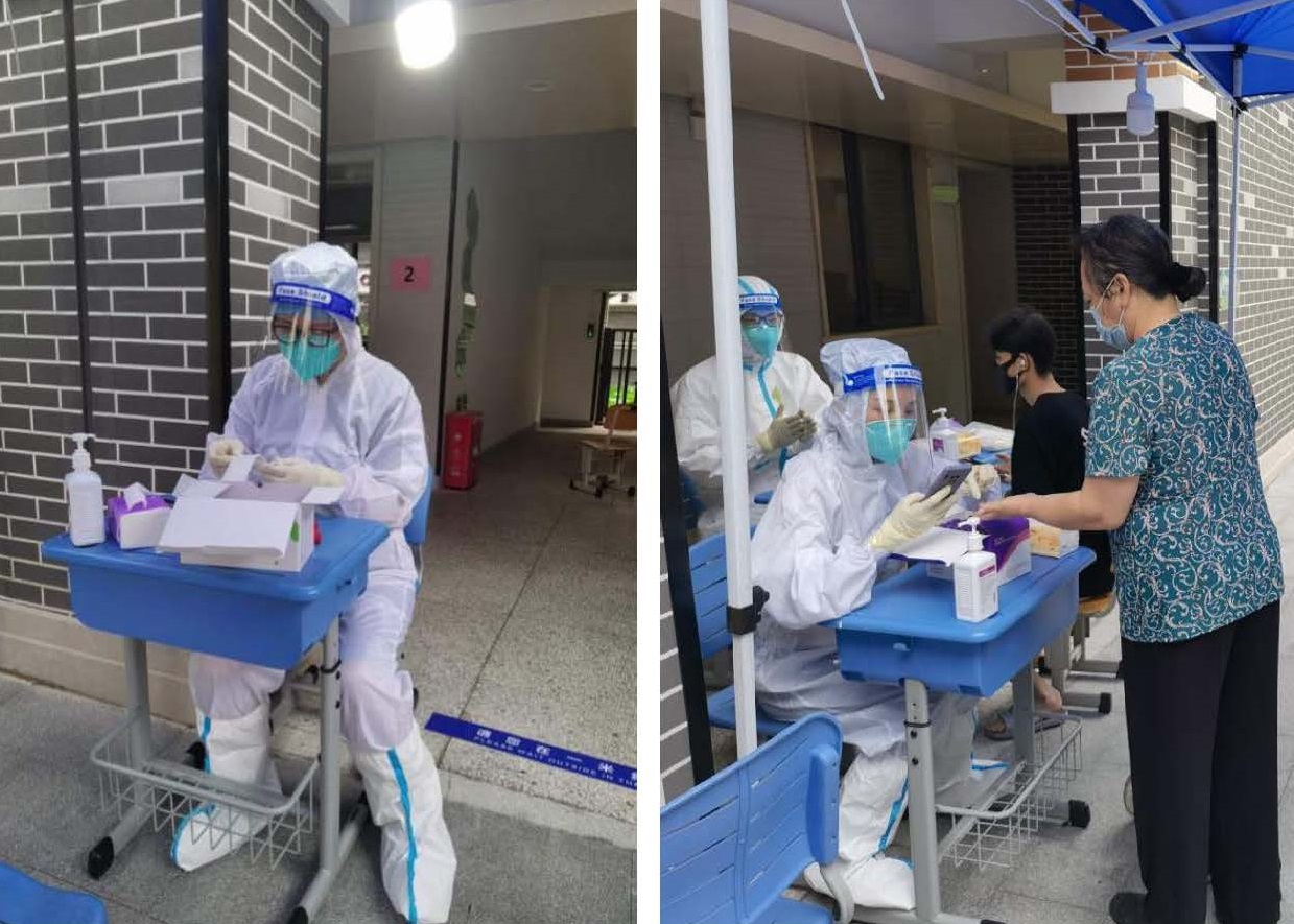 志愿者们奋战在抗疫第一线,在临时核酸检测点开展信息登记录入等工作。